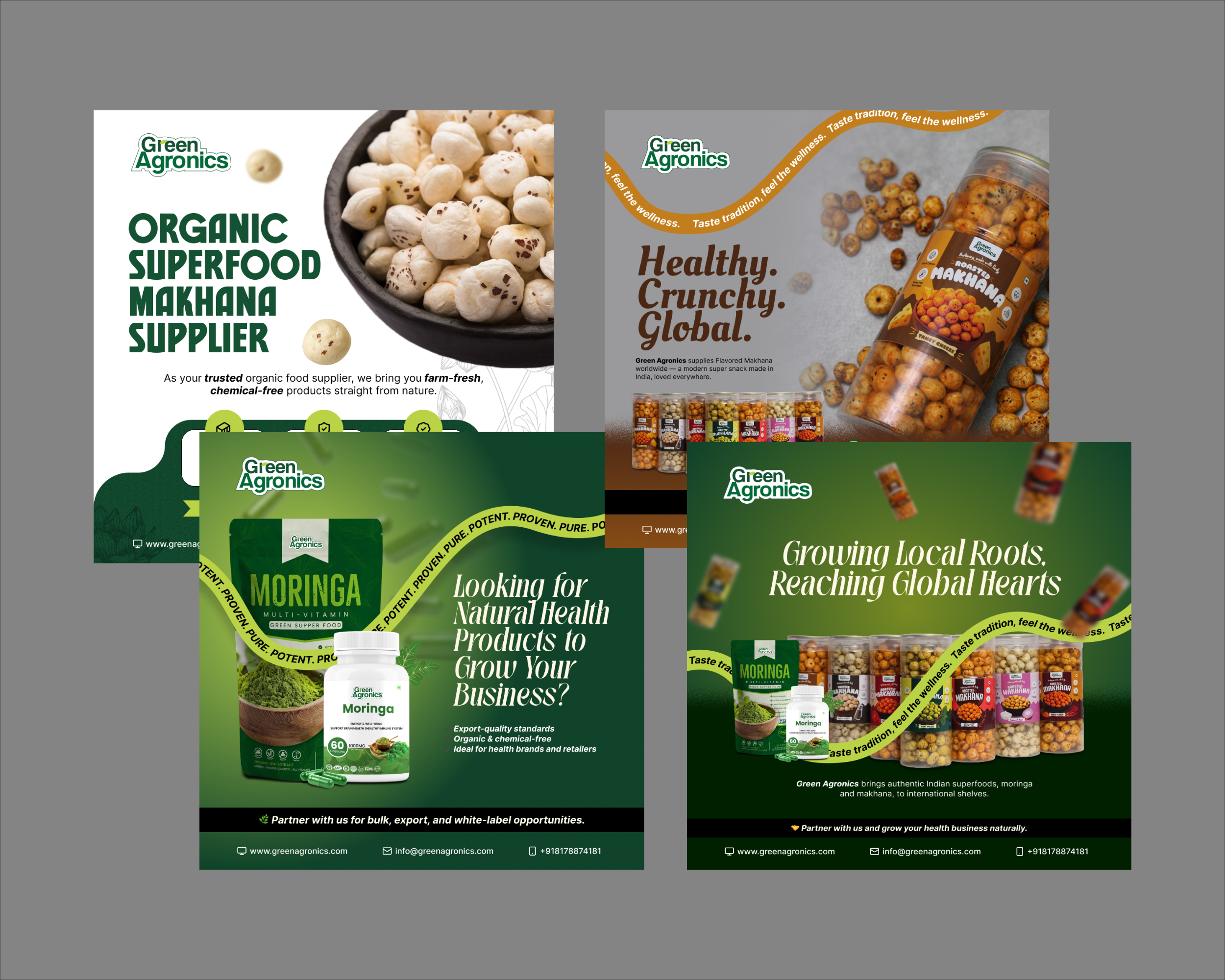Green Agaronics is a health-focused agri brand offering premium-quality makhana and natural food products. The goal was to create a strong, trustworthy, and modern brand identity that communicates purity, quality, and global readiness across all digital and print touchpoints.